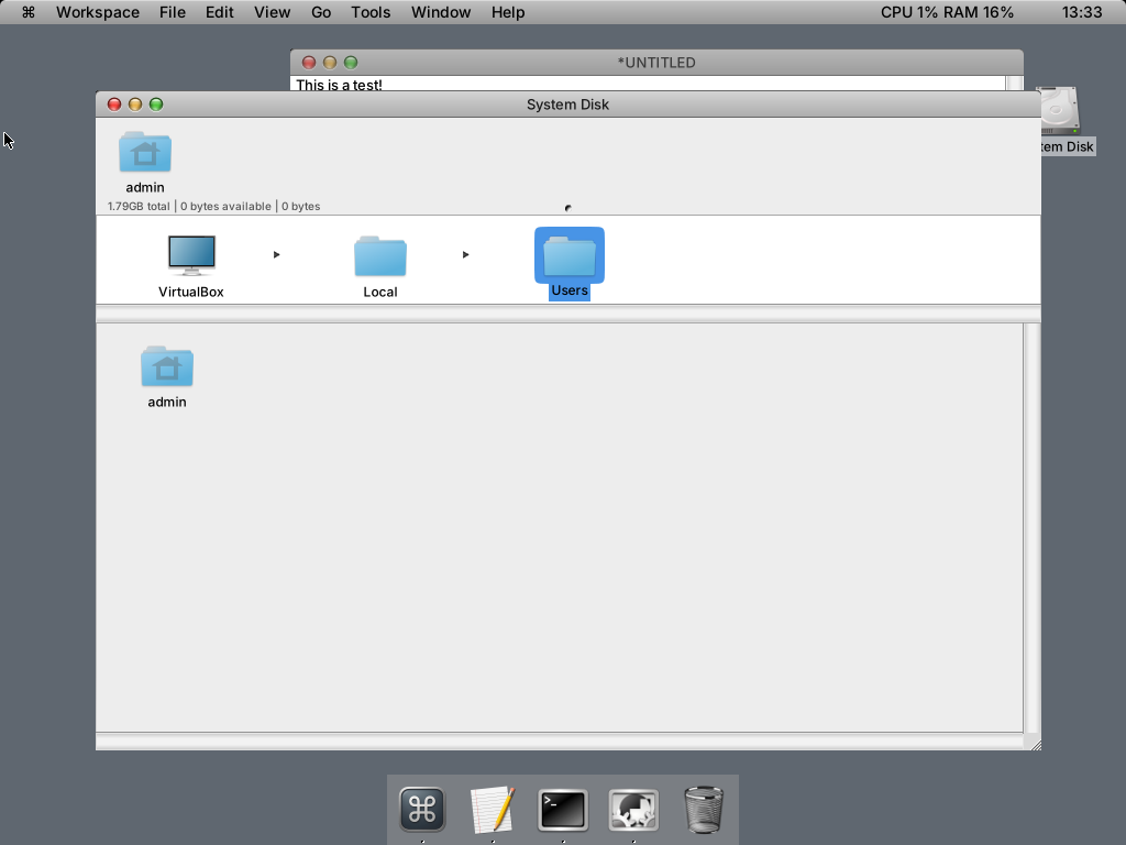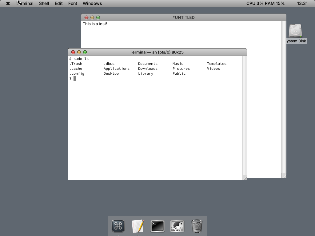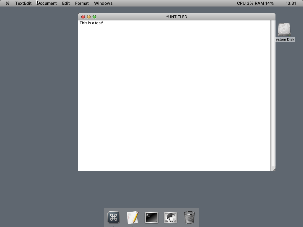 On the positive side, TextEdit and Terminal appear implemented and usable. Window controls behave correctly, although restoring minimized applications is not obvious. Firefox launched successfully, though it used its own window controls rather than the system style.